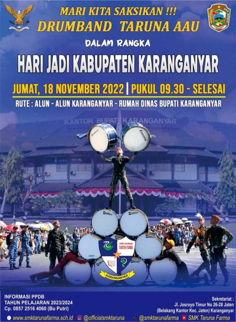 Bertepatan dengan hari jadi Karanganyar ke 105, kabupaten Karanganyar mengadakan pentas Drumband Angkatan AAU dengan rute dari Alun - alun Karanganyar hingga Rumah dinas Bupati Karanganyar.