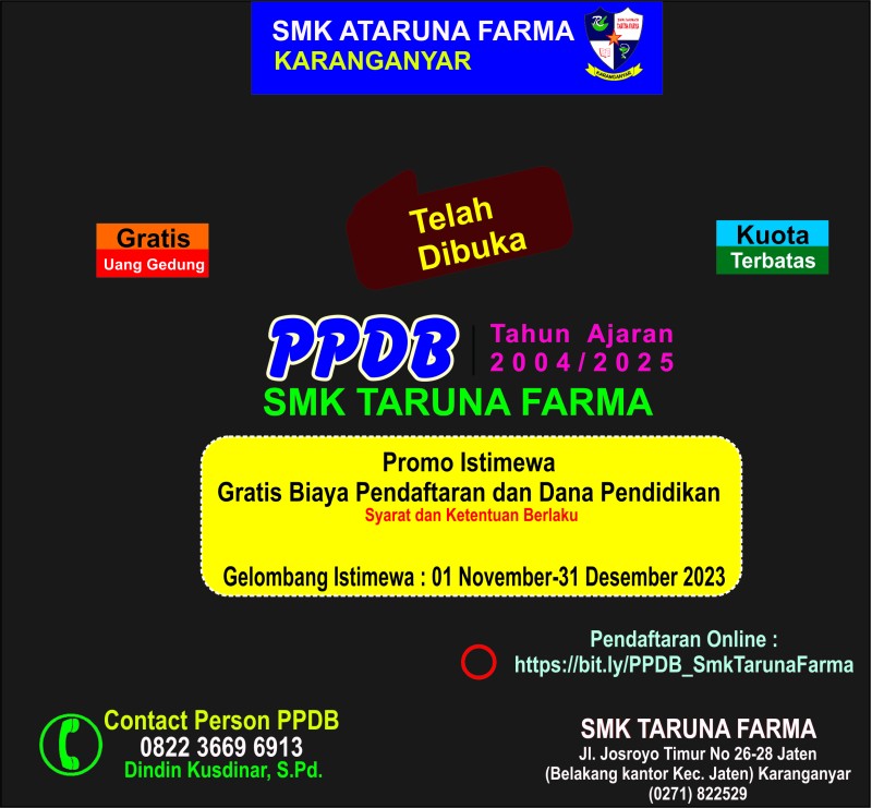 Bergabunglah bersama kami "SMK TARUNA FARMA" guna mewujudkan generasi anak bangsa yang cerdas, berkualitas, serta mampu menanamkan nilai-nilai positif di masyarakat.