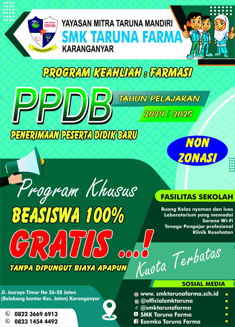 SMK Taruna Farma memberikan beasiswa sekolah gratis bagi siswa berprestasi di SMK Taruna Farma, dan siap menerima 100 pelajar berprestasi dari keluarga miskin di wilayah setempat maupun luar daerah. Program sekolah gratis ini memasuki tahun kedua. Program ini pertama kali dilakukan SMK Taruna Farma tahun 2023 lalu. Program sekolah gratis ini juga merupakan upaya SMK Taruna Farma untuk meningkatkan pelayanan pendidikan Syarat dan Ketentuan Kepala SMK Taruna Farma Karanganyar mengemukakan beasiswa sekolah gratis ini diperuntukkan pelajar dari keluarga miskin yang tercantum dalam DTKS (data terpadu kesejahteraan sosial) dan Pelajar juga harus memiliki motivasi belajar yang tinggi.